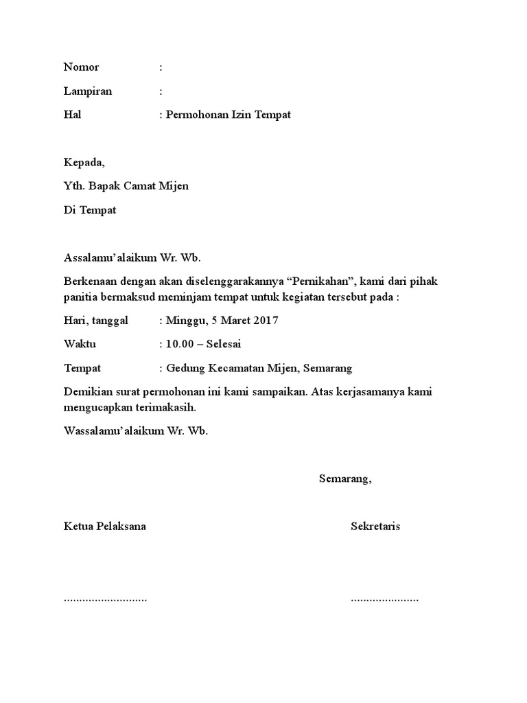 Doc Contoh Surat Permohonan Pinjam Tempat Josiah Onasis. Human translations with examples. Informasi lokasi hari dan jam pelaksanaan kegiatan telah diberitahukan dengan terperinci.
